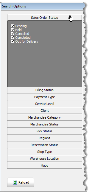 Exploring the "Search Options" window, you'll see a list of choices with one sections "open" to reveal its filter selections. That is a dynamically moving list so as you click on each section heading for example "Billing Status" the view will change from what is shown above to what is shown below. The same will happen as you cycle through each section as you select the matching header.